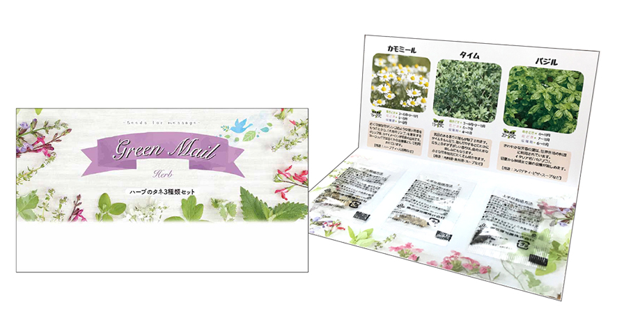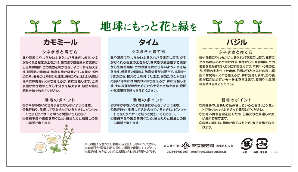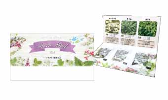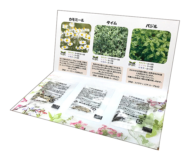 サイズ:縦90×横160mm 2ツ折時・OPP袋入 種はカモミール・タイム・バジルの3品種