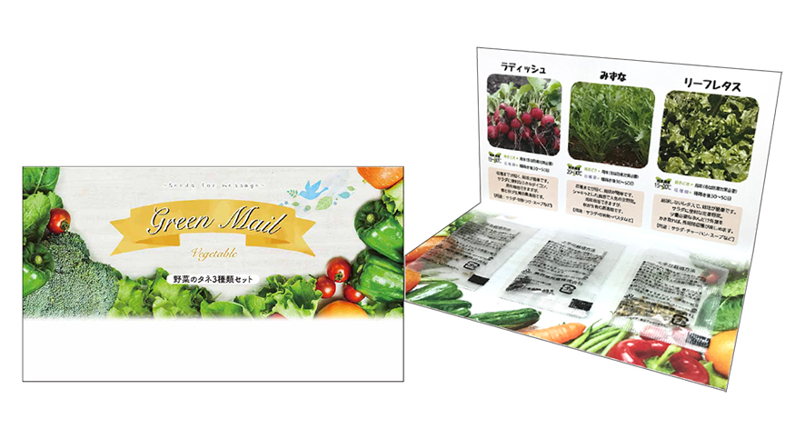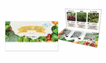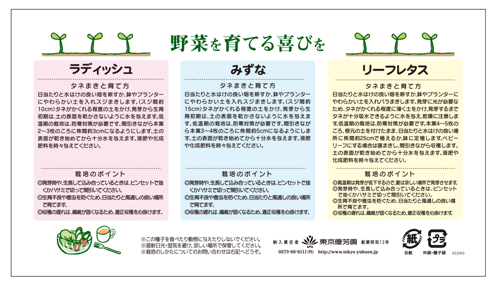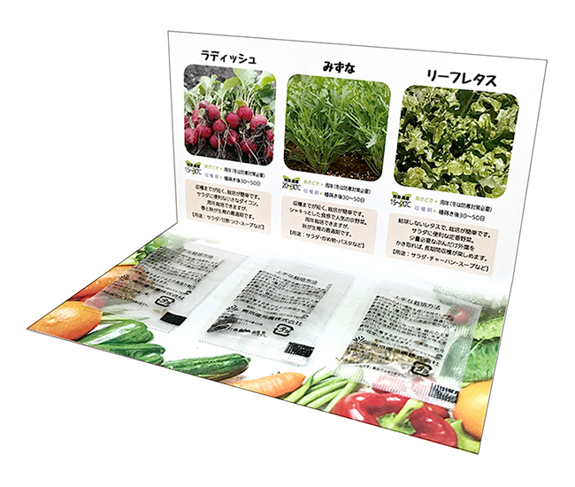サイズ:縦90×横160mm 2ツ折時・OPP袋入 種はラディッシュ・みずな・リーフレタスの3品種