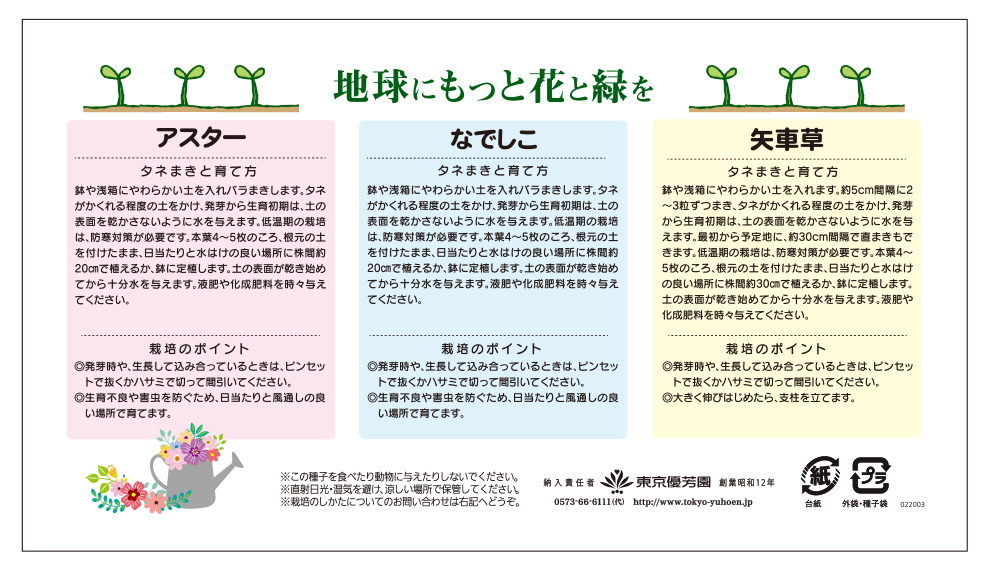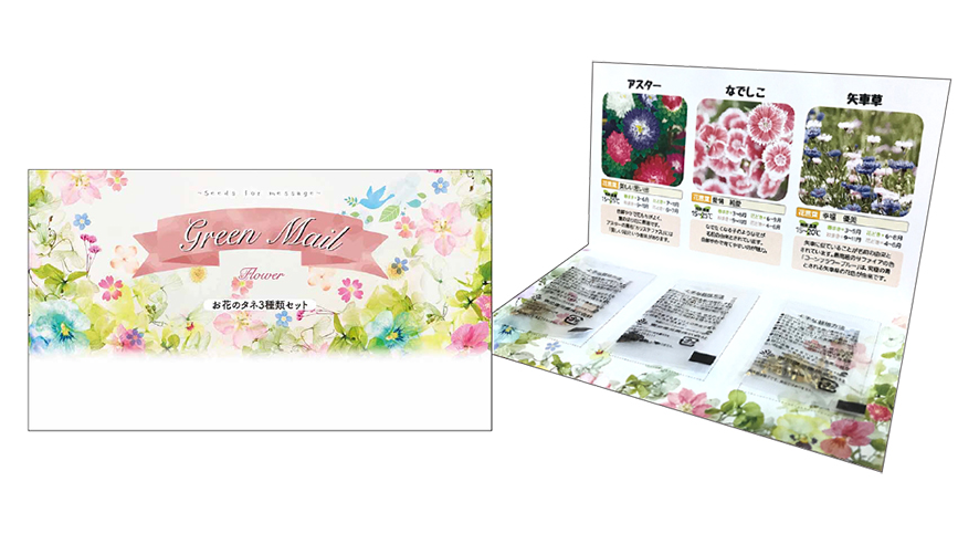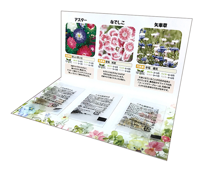 サイズ:縦90×横160mm 2ツ折時・OPP袋入 種はアスター・なでしこ・矢車草の3品種