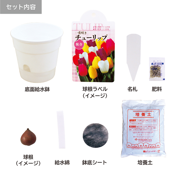 セット内容:底面給水鉢(直径125×高さ120mm)・タネまたは球根・培養土・肥料・名札・吸水綿・鉢底シート・球根ラベル(球根セットの場合のみ)・ケース(縦125×横125×高さ125mm)