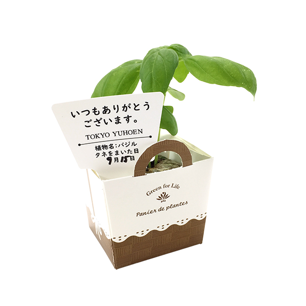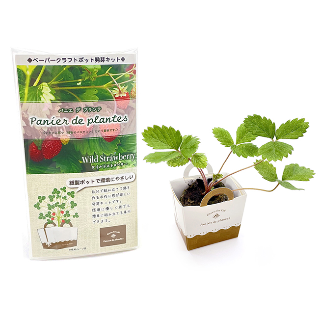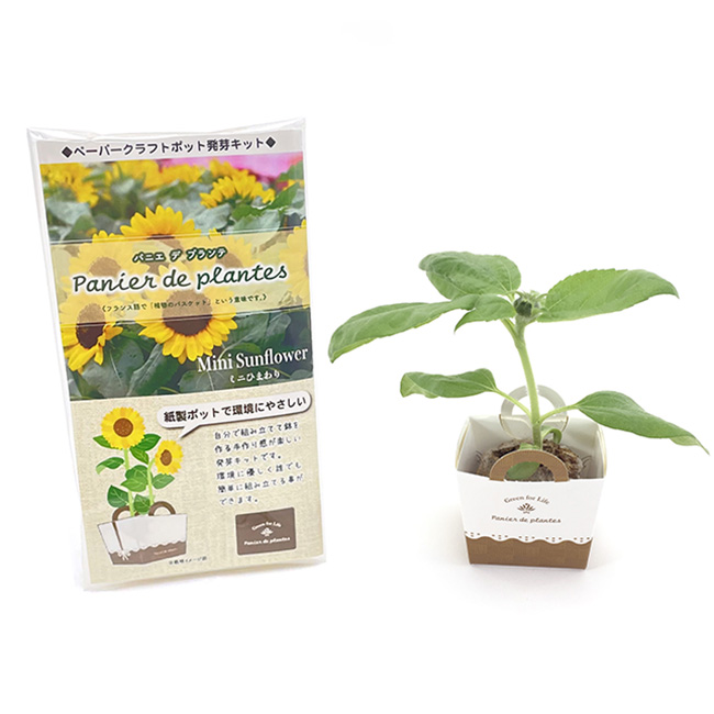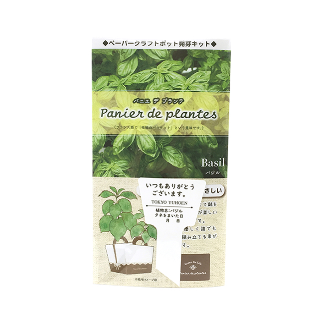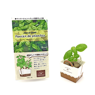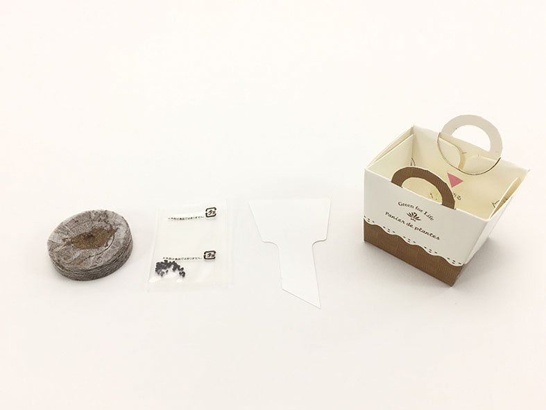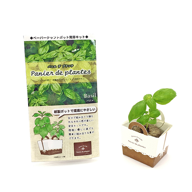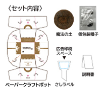 セット内容:ペーパークラフトポット:幅58×奥行45×高さ48mm・持手15mm(組み立て後のサイズ)、個包装種子、魔法の土、さしラベル、説明書