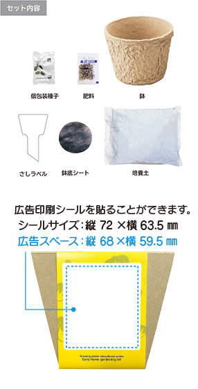 セット内容:鉢・個包装種子・培養土・さしラベル・肥料・鉢底シート