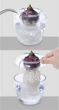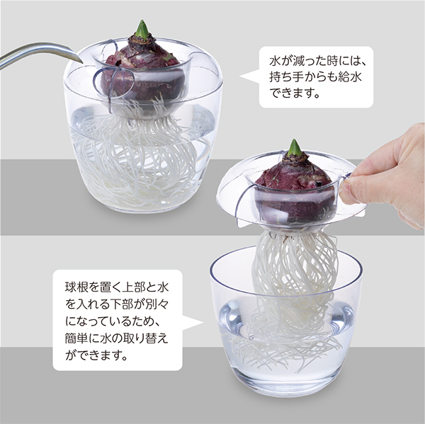 ◎球根を置く上部と水を入れる下部が別々になっているため、簡単に水の取り替えができます。
