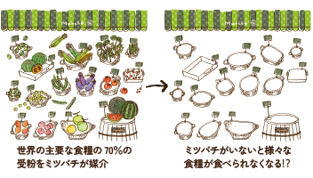 私たちの毎日の食事に欠かせない野菜や果物の多くは、ミツバチの授粉のおかげで実ります。