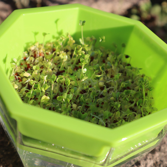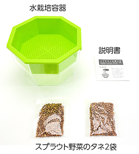スプラウトのタネ・水栽培容器(縦125×横125×高さ77mm)・説明書