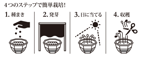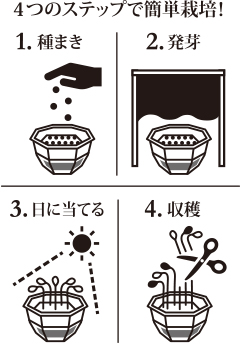 1.タネまき 2.発芽 3.日に当てる 4.収穫